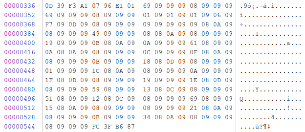 فایل حامل، هیچ فایل مشخصی رو نشون نمیده. وقتی فایل رو با یک هگز ادیتور باز میکنیم میبینیم که هیچ بایت NULL ای نداره. در عوض تعداد زیادی بایت 0x09 داره.