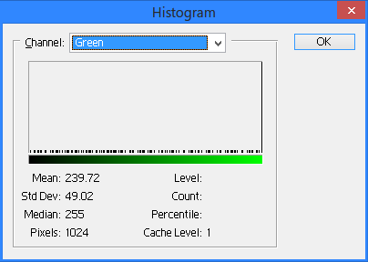 پیکسلهای رنگی فایل، رنگ سبزشون متغیره و بقیه رنگها ثابت هستند(0xFF). اگر هیستوگرام این فایل رو بگیریم میبینیم که شبیه یه رشته بیتی میشه.
